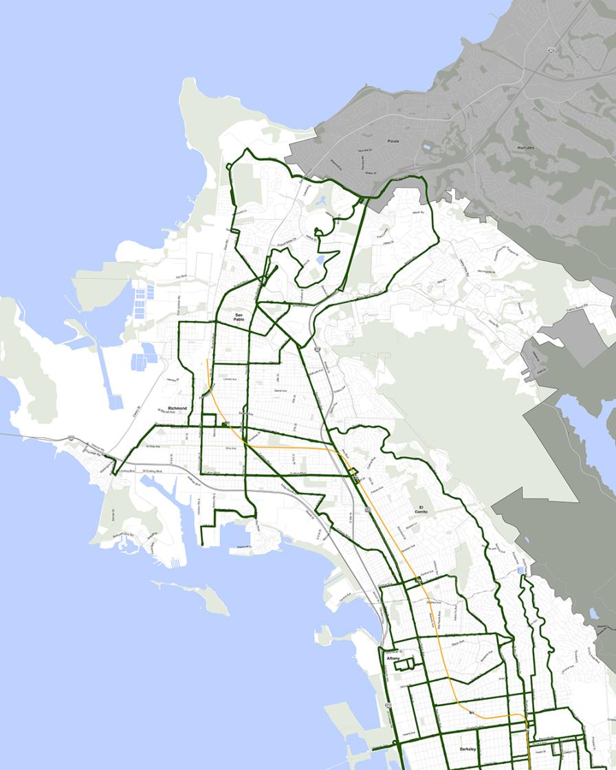 En este escenario propuesto de Servicio Frecuente (F), la línea 72R existente se consolidará en las líneas F72 y F72M para proporcionar un servicio más fiable en San Pablo Avenue. La línea F70 proporcionará un servicio adicional para hacer frente al aumento de la demanda a lo largo de Cutting Blvd. La nueva línea F72 dejará de prestar servicio a Hilltop Mall y la línea F76 prestará servicio a las zonas a las que antes prestaba servicio la línea 72 existente, incluida la comunidad de Rollingwood. Con el aumento del servicio en la línea F72M, la frecuencia a lo largo del corredor MacDonald se duplicará para satisfacer la demanda del índice de pasajeros. La nueva línea F74 permitirá disponer de más recursos para prestar un mayor servicio en la línea F71.