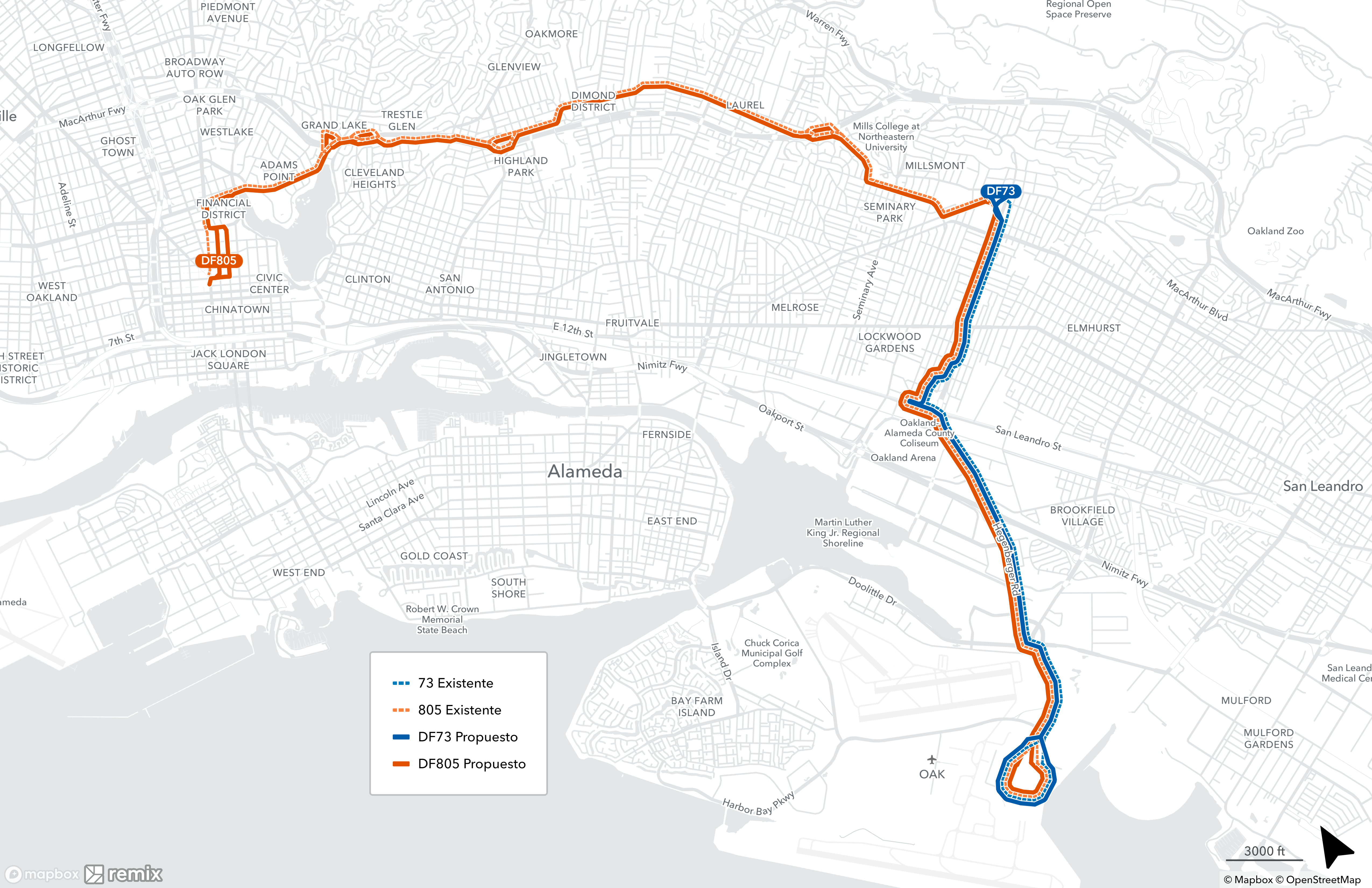 DF36 se extiende hasta Rockridge Bart a través de Piedmont Avenue, Warring Street, Derby Street, Claremont Boulevard y College Avenue. DF72 termina en Contra Costa College. La Línea DF18 se propone para extender la actual Línea 18 hasta Montclair a través de 11th/12th Street, 1st Avenue, E. 18th Street, Park Boulevard y Mountain Boulevard, reemplazando a la actual Línea 33, y su frecuencia se ha incrementado los días laborables a cada 15 minutos. DF19 ahora funciona entre Downtown Oakland y Fruitvale BART, y DF805 ofrece servicio nocturno 73 hacia el Coliseo, el aeropuerto de Oakland e Eastmont Transit Center. DF88 se extiende hasta Piedmont para reemplazar la actual Línea 33 y disminuye su frecuencia a cada 20 minutos. Las Líneas 1T, 6, 51A/B, 57, 800, 802, 851, E, F, FS, G, J, NL, P y V permanecen sin cambios, mientras que las Líneas C, CB y Z de Transbay se eliminarán.